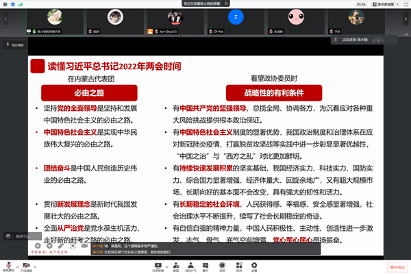 首先,支部书记陈大明同志做了“两会”精神学习的报告,并基于此从产业安全预警、能源安全、产业链/供应链安全以及粮食安全等几个方面,做了关于信息检索、素材追溯、深度思考与挖掘等情报分析和情报检索方法的培训。组织委员陆娇同志就“从严从紧、精准防控、统筹兼顾、共克时艰”四个方面介绍了居家防疫的一些注意事项,并以支部志愿者的行动案例并鼓励大家同舟共济、守望相助,共同战胜疫情。