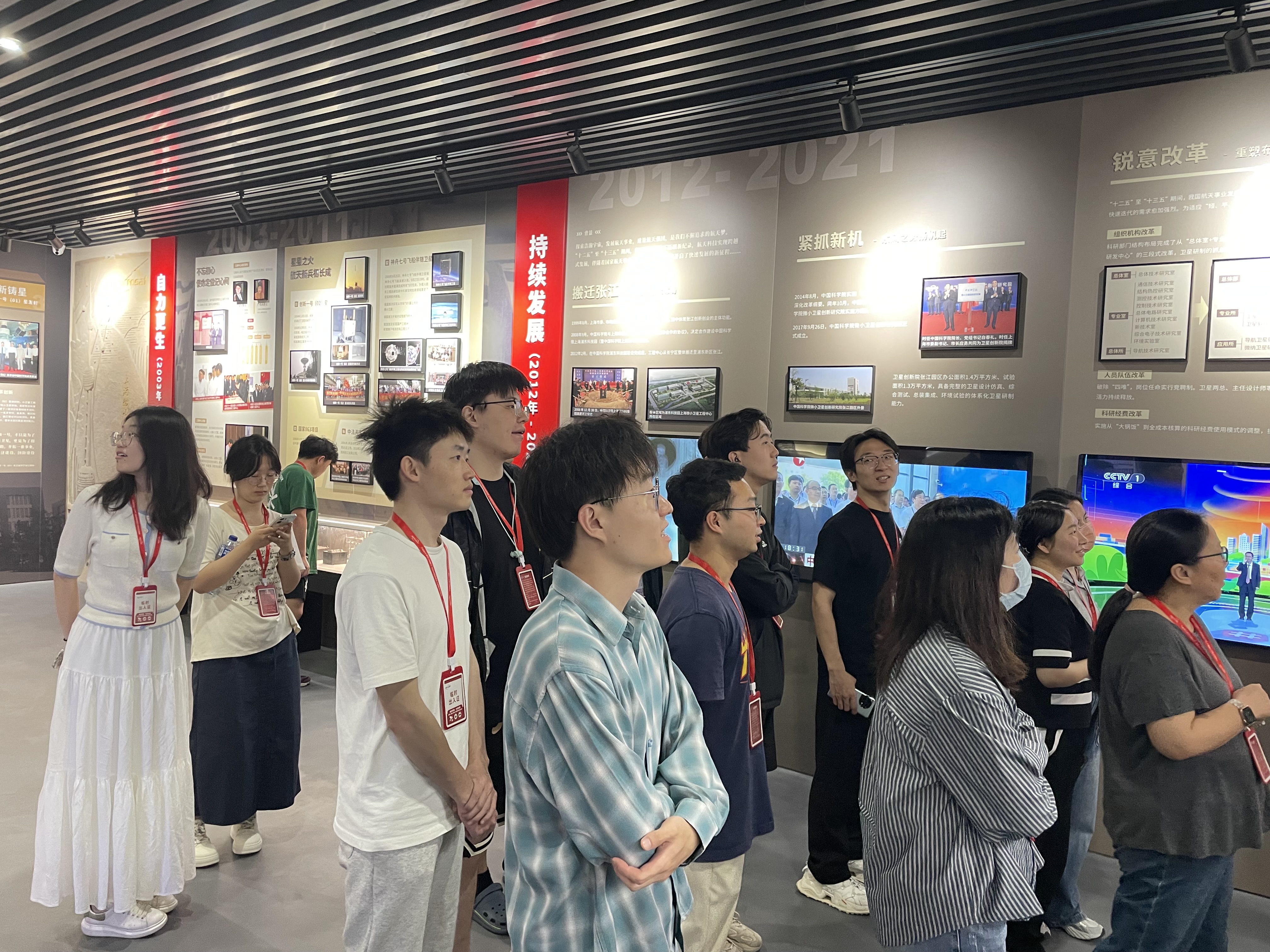 师生们首先参观了卫星创新院航天卫星科普教育基地(院史馆),通过图文展板、卫星模型和发射模拟视频等形式,系统地了解了研究院20年来的发展历程及其在北斗导航、量子通信、暗物质探测等领域取得的代表性科研成果。随后,师生们进入卫星研发总装厂房,近距离接触到包括“天宫二号”伴星、“悟空号”等卫星模型,深刻体会到航天工作者们身上的“三无精神”(无名英雄、无私奉献、无上光荣)与家国情怀。通过此次主题教育活动,师生们不仅收获了丰富的航天知识,更体会到了科学家们“特别能吃苦、特别能战斗、特别能攻关、特别能奉献”的精神。