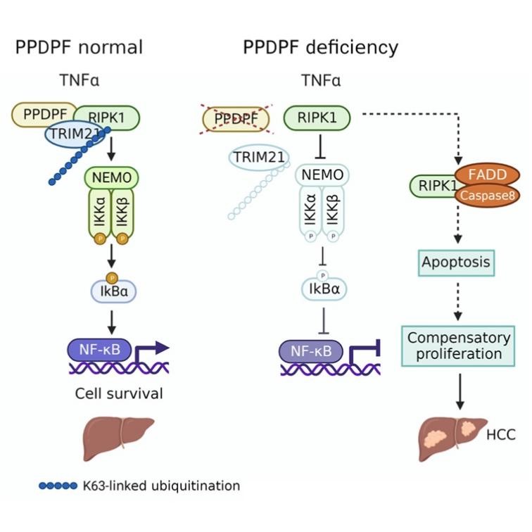 该研究发现,PPDPF在肝癌中表达显著下调,PPDPF低表达的患者预后较差。在肝癌小鼠模型中敲除Ppdpf促进HCC的发生发展。分子机制研究表明PPDPF缺失抑制NF-κB信号通路的激活,使肝细胞发生细胞凋亡,进而引发补偿性的细胞增殖。进一步研究揭示PPDPF可以与RIPK1发生相互作用,通过招募TRIM21促进RIPK1 140位赖氨酸K63连接的泛素化,从而激活NF-κB信号通路。在临床样本中,研究人员发现PPDPF的表达和NF-κB激活标志p-P65的表达呈正相关。综上所述,该研究揭示了PPDPF调控NF-κB信号通路的新机制,同时提示PPDPF可能是一种治疗肝癌的潜在候选分子。