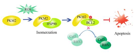 ? ? 肿瘤细胞中,氧化压力刺激PKM2在HSP90的帮助下发生异构化,同时转移到线粒体上,通过磷酸化Bcl2的第69位苏氨酸,阻断Cul3-RBX1与Bcl2的结合,从而稳定了Bcl2的蛋白水平,抑制细胞凋亡。
