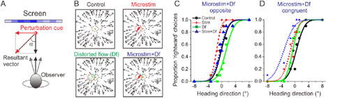 (A)局部物体运动干扰示意图;在观测者自身发生运动时(黑色箭头),局部的物体被加入额外的(物体自身)运动的向量(红色箭头)后,在视网膜上呈现出的合成运动向量偏移原始方向向量α度(实验中约6度)。(B-D)电刺激与局部向量干扰对行为的交互影响;(B)四种穿插在一次实验中的实验条件:对照(无电刺激和局部向量干扰,左上),电刺激(右上),变形的光流场(局部向量干扰,左下),同时给电刺激和局部向量干扰(右下);(C)当同时给电刺激和视觉向量干扰时,两者产生的效应是反向的情况(红:在有电刺激的条件下的心理物理曲线;绿:在给局部向量干扰时的心理物理曲线;蓝:同时给电刺激和局部向量干扰)。(D)当同时给电刺激和视觉向量干扰时,两者产生的效应是同向的情况?!?nbsp;