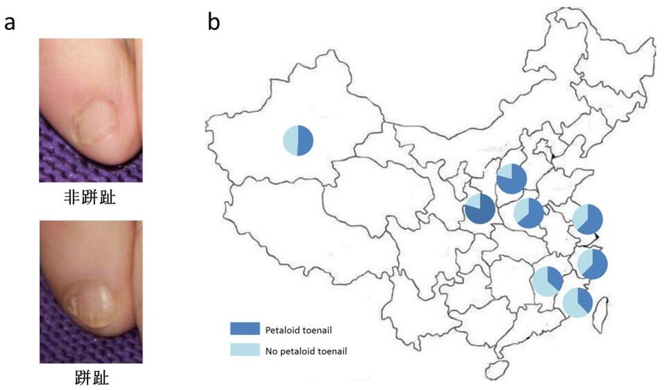 2016年12月20日,Journal of Genetics and Genomics杂志在线发表了中国科学院-马普学会计算生物学伙伴研究所汪思佳研究组与复旦大学李辉研究组合作的最新研究成果:“Large-scale genome-wide scans do not support petaloid toenail as a Mendelian trait”(《全基因组关联分析不支持跰趾是孟德尔性状》)。跰趾,也称为瓣状甲,是指小脚趾甲分瓣的特征。该研究针对汉族群体中广泛存在的跰趾特征进行了分析,发现跰趾并非是汉族群体所独有,在新疆维吾尔族群体中也有较高频率分布。而较之前普遍认可的孟德尔显性遗传,该特征更可能是由多个微效基因共同影响。
