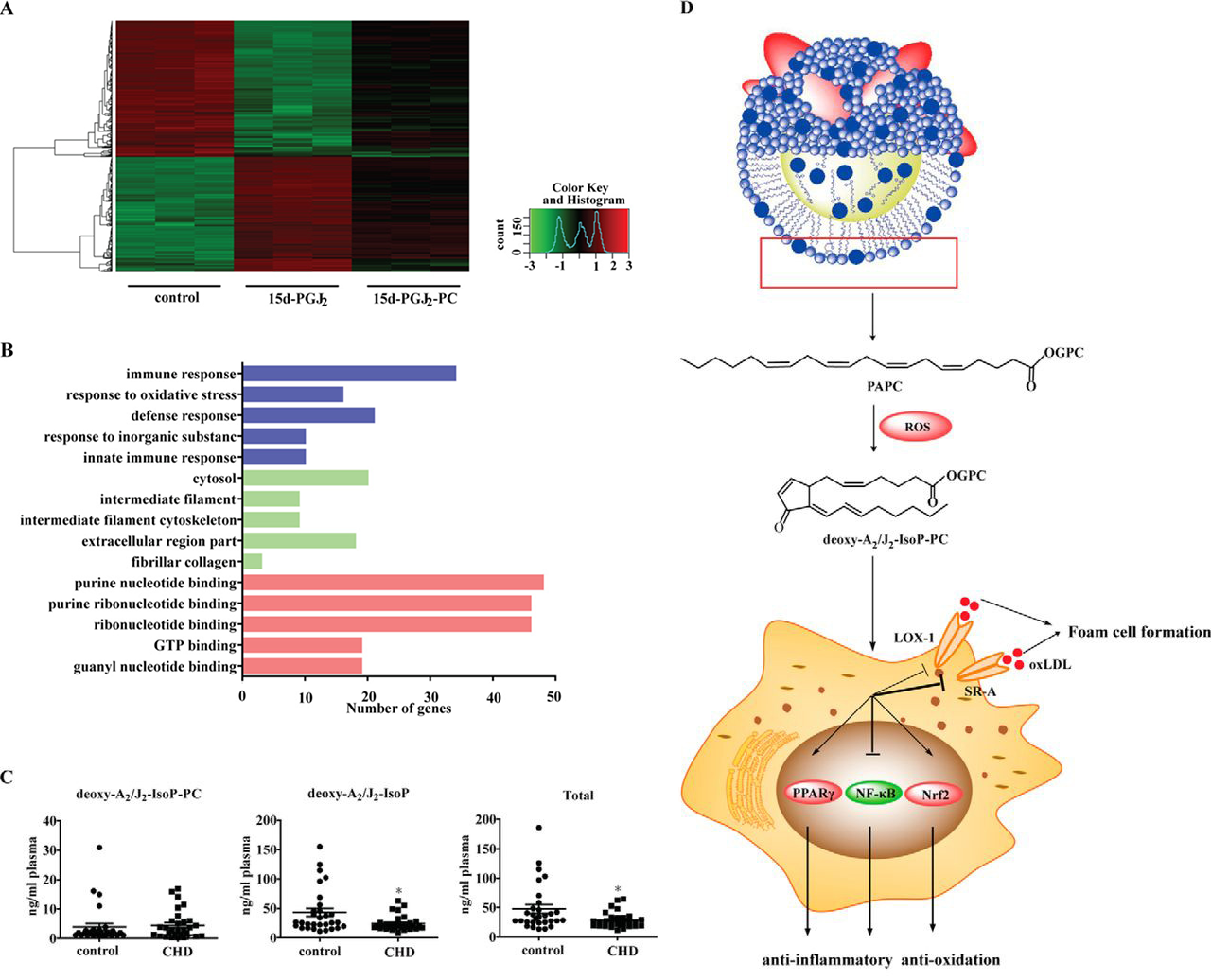 (A)转录组学发现这类氧化产物和前列腺素15d-PGJ2影响不同基因表达。(B)氧化应激和炎症响应是该氧化产物影响的主要途径。(C)在心血管病人血浆中这类氧化产物水平降低,提示可能具有保护作用。(D)这氧化产物的形成和可能的作用机制。