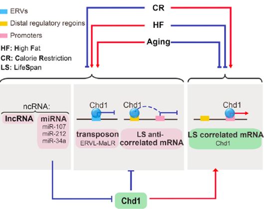 研究人员利用高通量测序技术,得到了在不同能量摄入以及消耗下的小鼠肝脏的小RNA,编码和长非编码RNA的表达,并通过计算生物学分析手段,发现:1) 不同的干预引起的寿命延长很大程度上抑制了小RNA,长非编码RNA 和 转座子的表达。2)此类小RNA倾向于调控与寿命正相关的蛋白编码信使RNA。3)在小RNA-靶标相互作用中,小RNA大部分靶向于与染色质功能相关的蛋白。此外,他们通过实验证明了miR-34a, miR-107, 和 miR-212-3p 靶向染色质重塑蛋白Chd1, 并证实了Chd1在模拟由高脂和衰老引起的基因表达变化和转座子活化中的作用。
