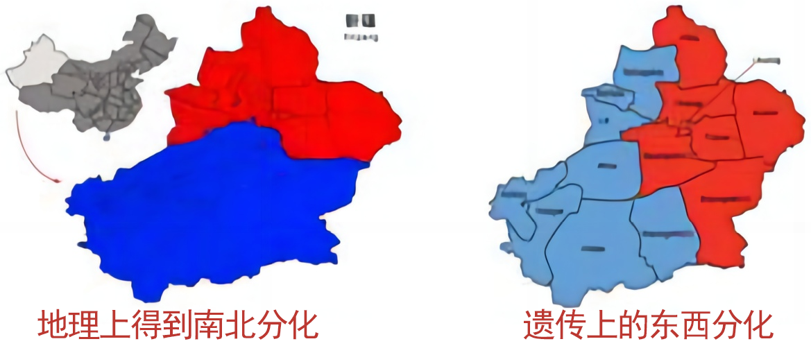 图1.维吾尔族人群在地理上的南北分布以及在遗传上的东西分化