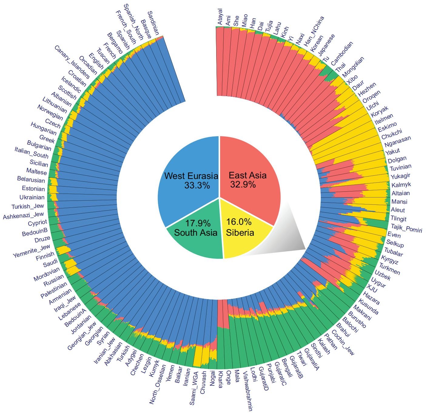 研究发现,维吾尔族人群的遗传成分主要起源于欧亚大陆上东、南、西、北四个方位的已分化的人群,大致可以由现代东亚人(约28.8% – 46.5%),南亚人(约12.0% - 19.9%),西欧人(约24.9% – 36.6%)和西伯利亚人(约15.2% – 16.8%)来代表(图2)。有趣的是,这四种遗传成分比例在东北部和西南部维族亚群体中呈现显著的差别。来自东部(东亚和西伯利亚)的遗传成分在东北维族人群中要显著高于西南维族人群,并随着经度的增加而增加(越往西成分越少),而来自西部(西欧和南亚)的遗传成分则正好呈现相反的趋势。这个结果揭示了来自相邻人群的基因流可能是维族在遗传结构上呈现“东-西”分化的重要因素。