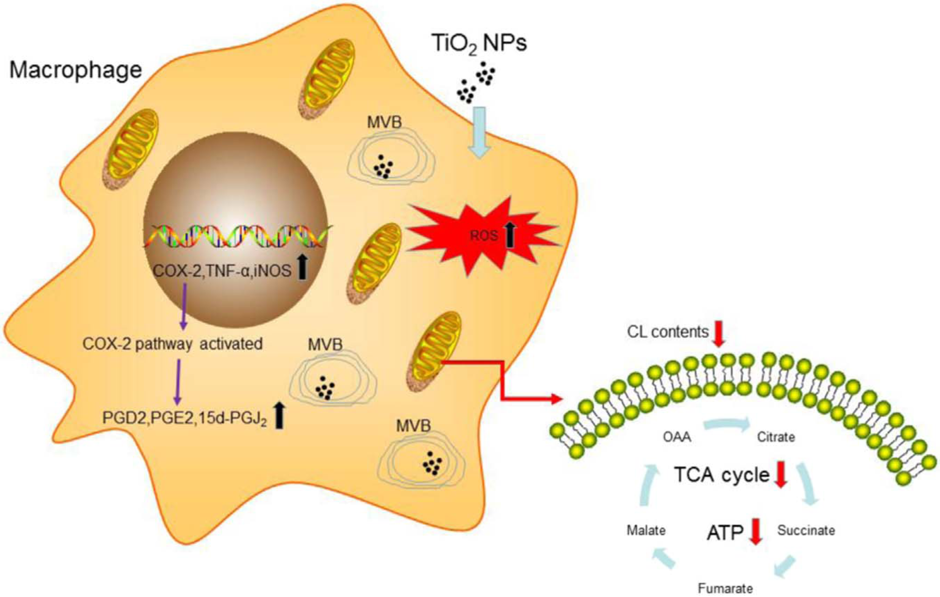 图.TiO2纳米颗粒对巨噬细胞代谢和功能的影响