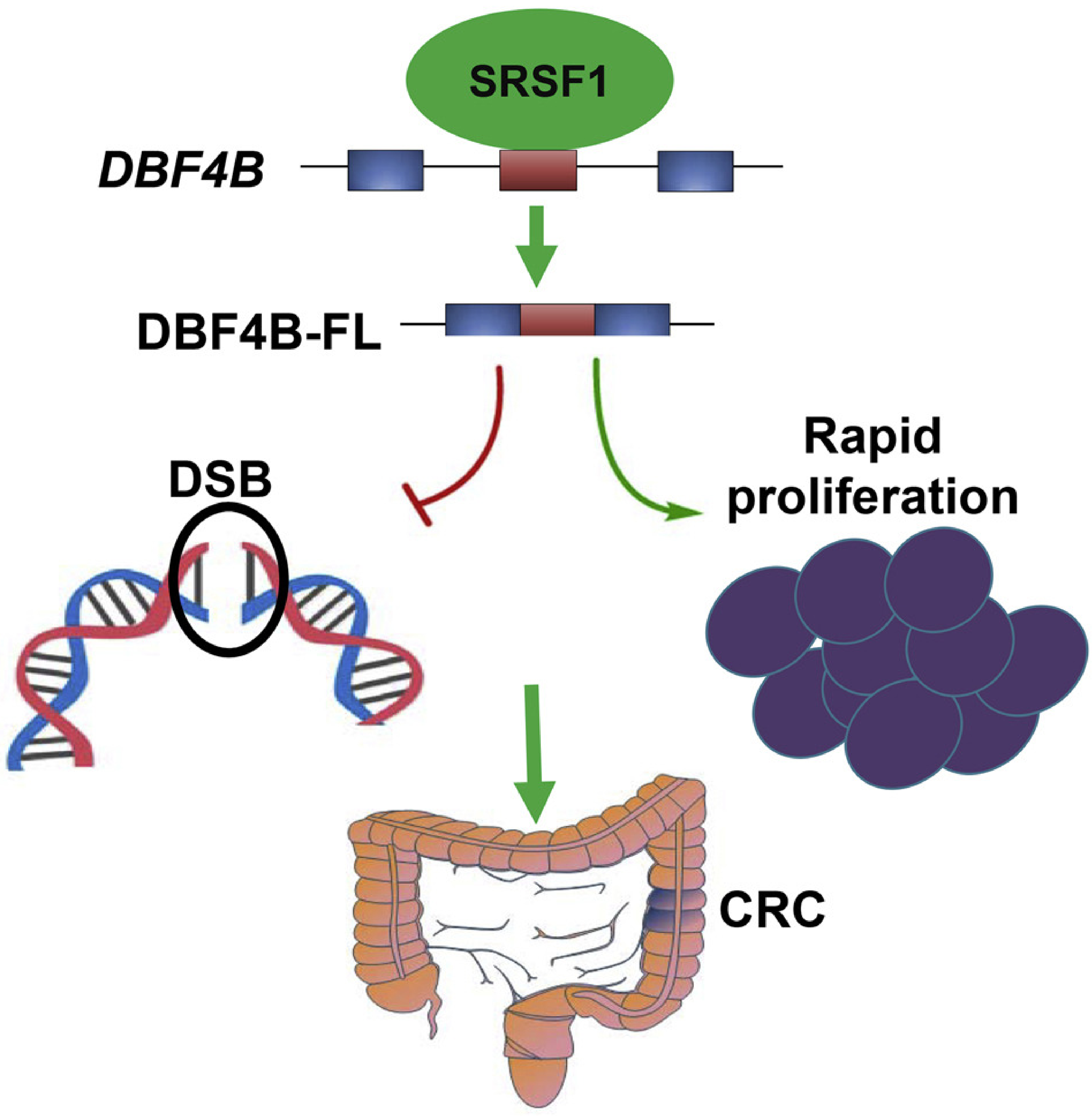在冯英研究员的指导下,博士生陈琳琳等发现DBF4B 6号外显子的剪接主要受剪接调控因子SRSF1调控。对DBF4B两种主要的剪接异构体形式进行功能研究,发现DBF4B-FL及SRSF1均能够促进结直肠癌细胞的增殖及体内外成瘤能力,敲减DBF4B-FL及SRSF1可以引起DNA双链断裂,说明其在维持基因组稳定性方面发挥重要作用。在结直肠癌组织中,DBF4B 6号外显子接入增加与SRSF1表达呈正相关。该研究进一步表明DBF4B与SRSF1在结直肠癌发生发展进程中具有重要的生物学意义。