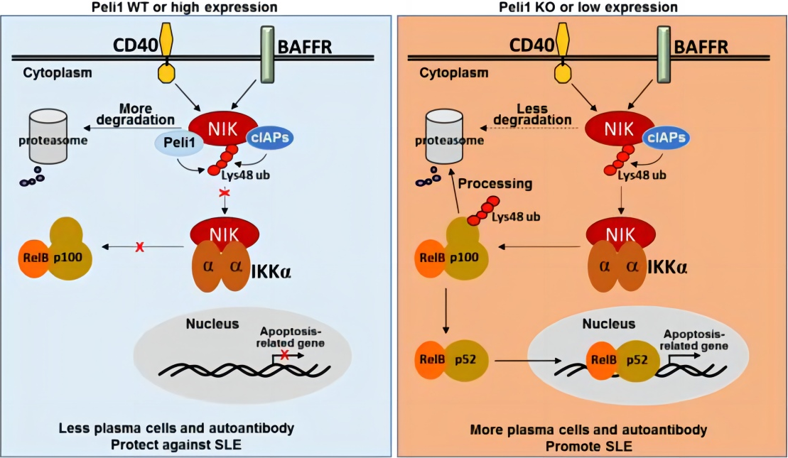 3月19日,国际学术期刊Nature Communications在线发表了中国科学院上海营养与健康研究院(暂名)肖意传研究组的研究论文“Peli1 negatively regulates noncanonical NF-κB signaling to restrain systemic lupus erythematosus”。该研究揭示E3泛素连接酶Peli1在系统性红斑狼疮(systemic lupus erythematosus,SLE)中的关键作用,研究表明Peli1的缺失影响NIK的泛素化降解作用,导致NIK的堆积与非经典NF-κB信号通路过度活化,进而促进抗自身抗体的大量分泌及自身免疫性炎症的发生发展。