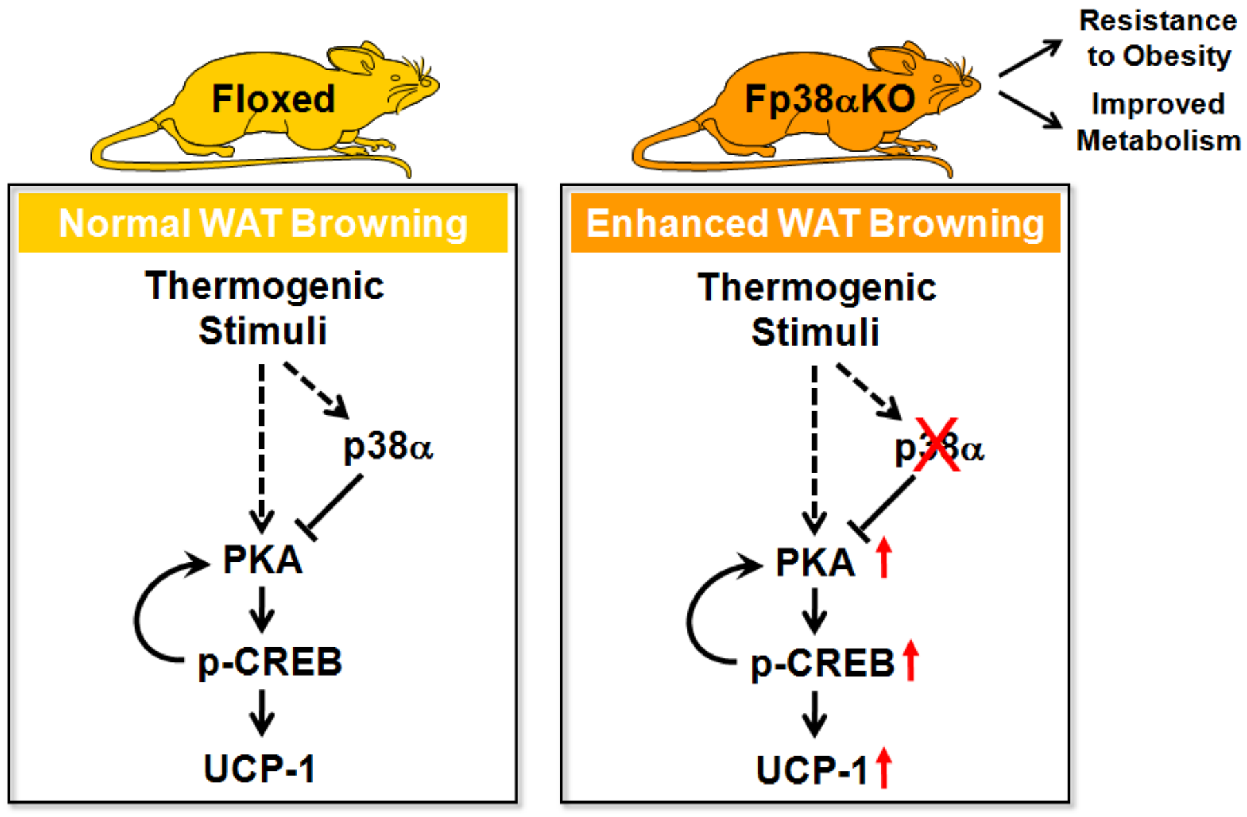 在这项最新的研究中,博士研究生张圣洁等人在应浩研究员的指导下,发现脂肪组织特异敲除p38α后小鼠的体重减轻,但是体温维持能力以及褐色脂肪产热功能基本不受影响。而在低温环境下,白色脂肪p38α缺失后能够观察到米色脂肪细胞比对照明显增多,米色化活动加剧。在β肾上腺素受体激动剂CL316,243的刺激下,脂肪组织p38α缺失的小鼠能量消耗显著增加。通过基因敲除小鼠和抑制剂定点注射两种手段,发现p38α缺失或活性受损后能够抵抗高脂饮食诱导的肥胖以及db/db小鼠体重的上升。通过一系列体外水平实验,发现p38α缺失后在白色脂肪细胞中PKA以及CREB的活性同时上调,促进UCP1的转录表达,细胞的米色化进程加快,能量消耗增加。