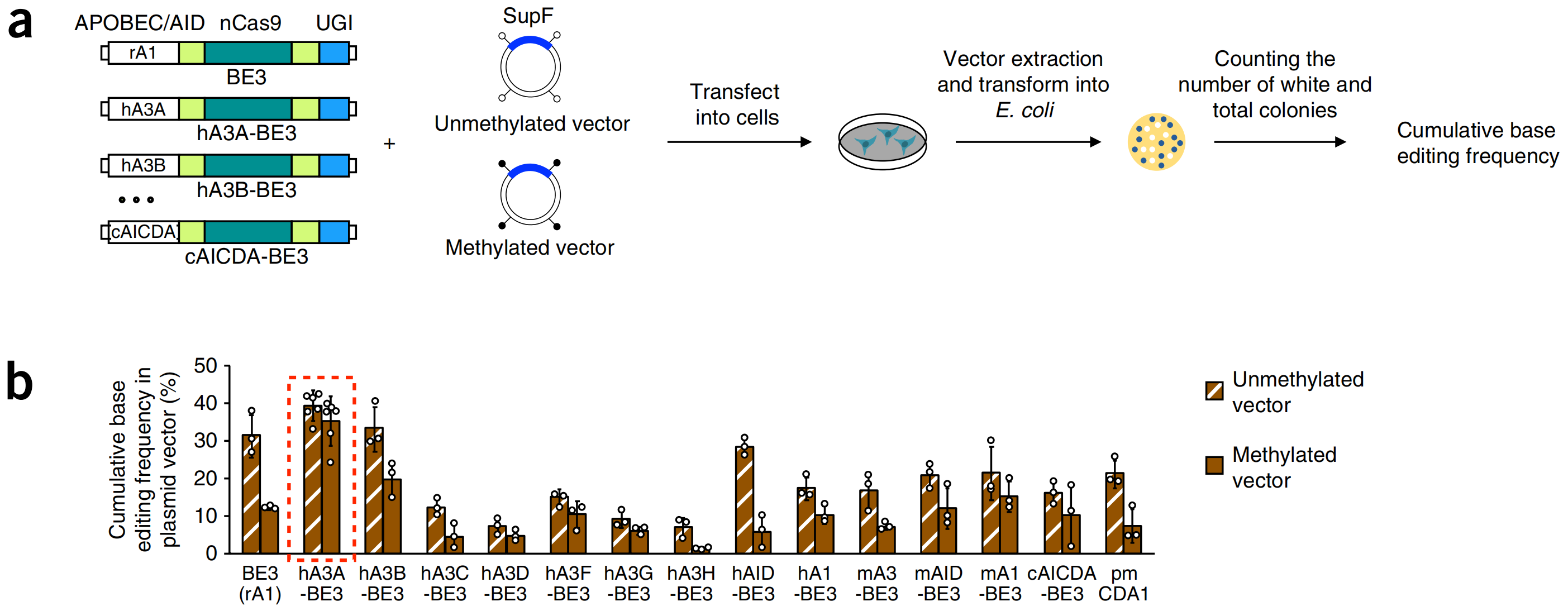 (a)构建多种碱基编辑器并筛选其在高甲基化区域的编辑效率。(b)基于人APOBEC3A的碱基编辑器(hA3A-BE3)能够在高甲基化区域进行高效碱基编辑。