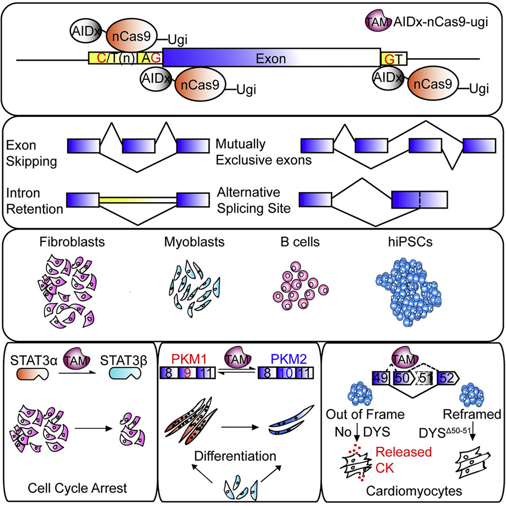 在这一新研究中,博士研究生袁娟娟和马云青首先注意到,98%以上的内含子有保守的GU(内含子开始)和AG(内含子末尾)序列,推测如果可以高效精确的将G突变成A, 可以特异性阻断外显子识别,调控内源性mRNA的剪切。通过这一策略,利用TAM诱导剪接位点DNA上G>A突变,就可以诱导可变外显子(alternative exon)及组成性外显子(constitutive exon)的跳读(Exon skipping);改变可变剪接位点的选择(Alternative splice site);调节互斥外显子的选择(mutually exclusive exons);诱导小的内含子的包含(intron retention)。此外,如果通过TAM将3'剪接位点上游polypyrimidine track中包含的C向T突变,可以促进下游外显子的包含。因此,利用TAM可以成功的实现针对RNA剪接的“loss of function”和”gain of function”调控。