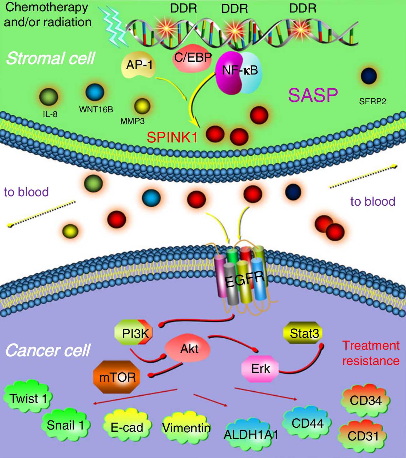 肿瘤微环境中衰老细胞衍生的SASP因子SPINK1激活残存癌细胞、导致其获得性耐药发生发展的分子机制