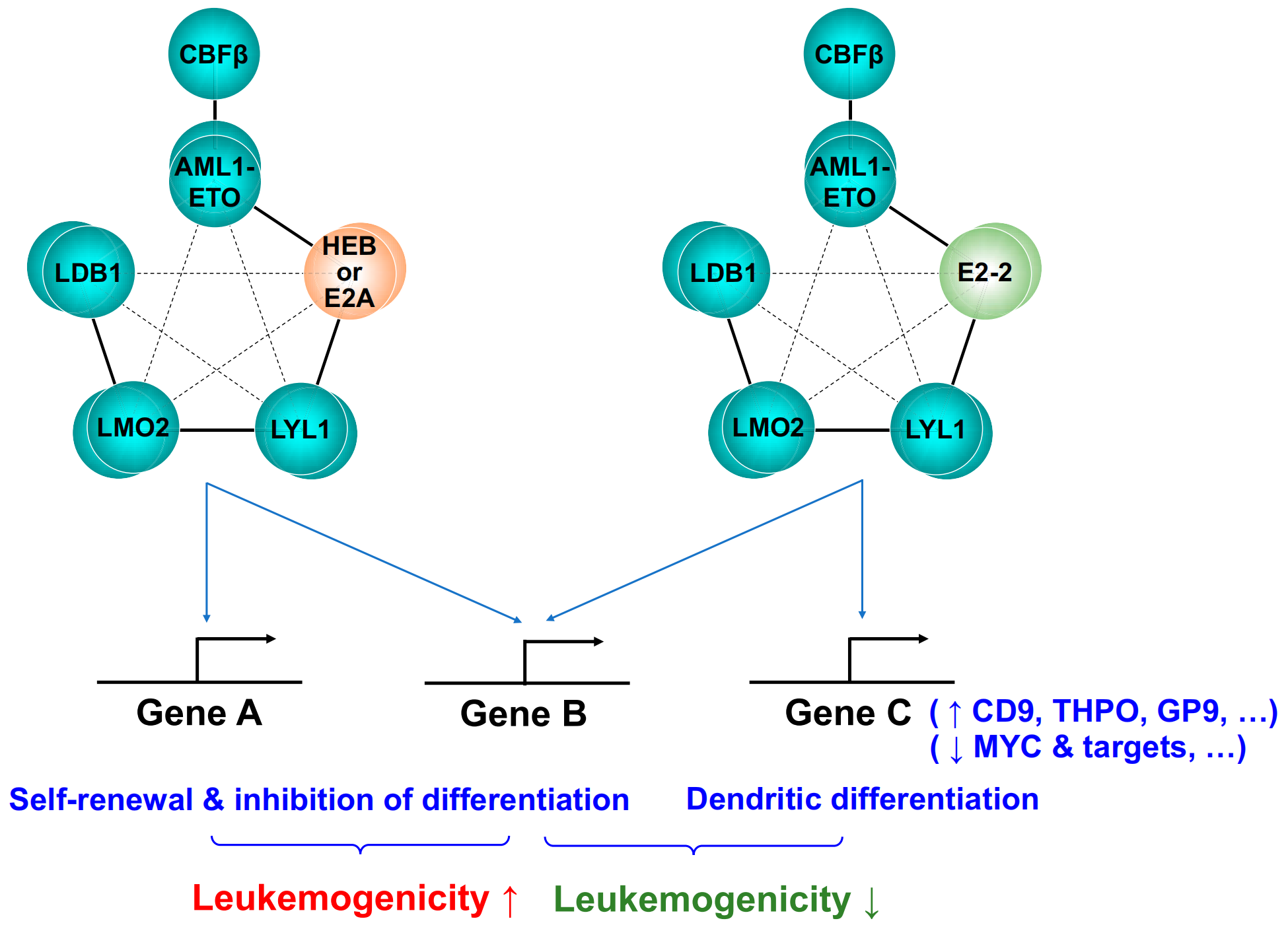 图:E蛋白家族成员HEB, E2A和E2-2在白血病发生过程中所扮演的不同角色式。