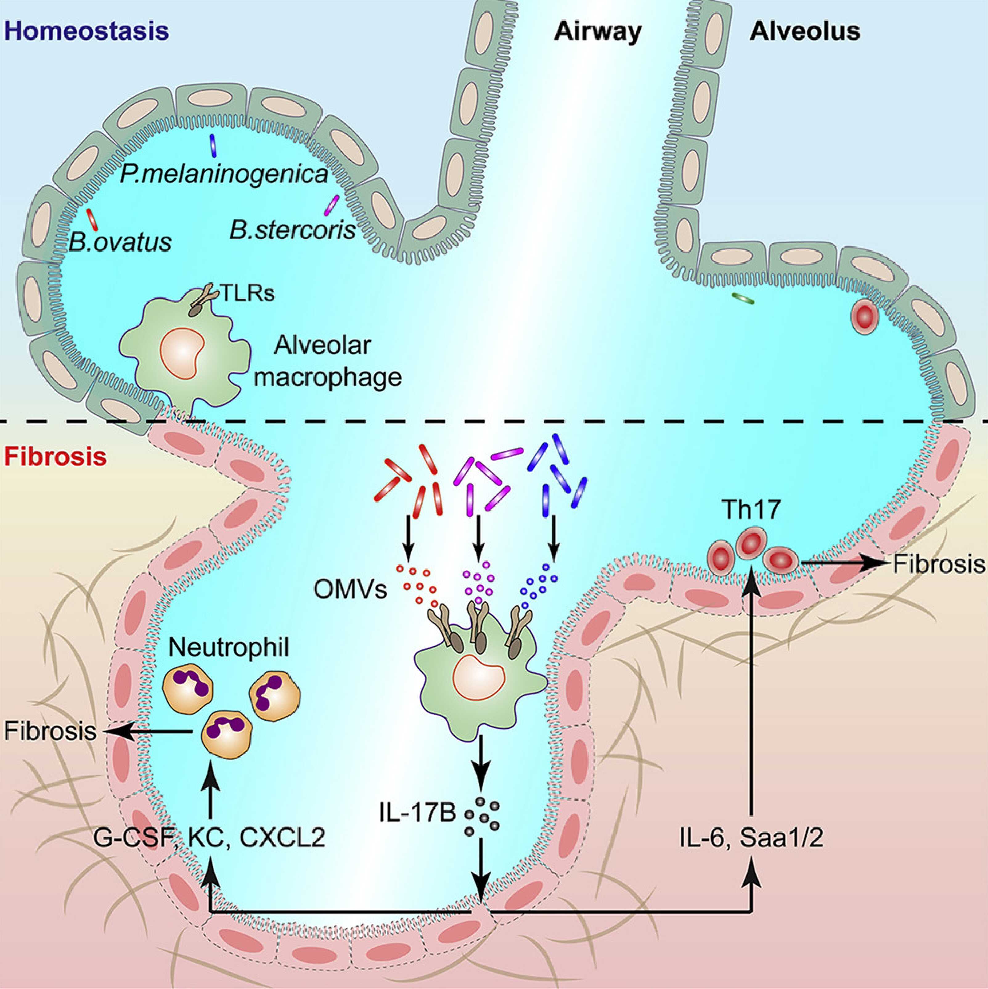 通过高通量测序等手段研究人员发现在正常小鼠肺组织中也存在着相对丰富的微生态菌群,而在肺纤维化病理组织中菌群发生明显紊乱,并且紊乱的肺部菌群对肺纤维化的发生至关重要。接下来的研究发现肺部菌群可以通过诱导IL-17B的表达促进肺纤维化的发生??股厍宄尾烤旱男∈?、无菌小鼠以及IL-17B缺失的小鼠都表现出肺纤维化减轻的表型。进一步研究鉴定发现Bacteroides和Prevotella两个属的细菌在肺纤维化过程中明显升高,并且可以通过分泌OMVs促进IL-17B的分泌。利用骨髓移植、细胞分选等实验手段研究发现IL-17B主要由肺泡巨噬细胞产生,并且发现OMVs是通过其携带的脂多糖和脂蛋白等成分作用于肺泡巨噬细胞的TLR2、TLR4受体激活下游Myd88介导的信号从而促进IL-17B的表达。此外,研究发现IL-17B可以直接作用于肺部上皮细胞诱导下游基因的表达从而促进中性粒细胞的招募以及Th17细胞的分化最终促进肺纤维化的发生。