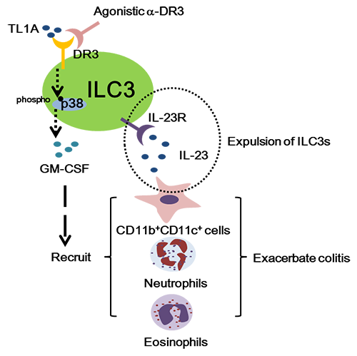 该项研究利用DR3激动性抗体(α-DR3)在体内激活TL1A/DR3信号,从而研究TL1A/DR3信号对ILC3的调控作用。研究发现激活DR3信号会造成大肠ILC3细胞数目的减少。利用中和性抗体中和体内的GM-CSF和IL-23都能够显著地逆转α-DR3引起的大肠ILC3减少?;蒲芯糠⑾郑?DR3通过活化ILC3的p38信号通路从而促进其GM-CSF的分泌。GM-CSF分泌的增加能够进一步导致招募致炎性髓系细胞(嗜酸性粒细胞、巨噬细胞以及中性粒细胞)到肠道,髓系来源细胞的浸润最终造成IL-23表达的增加和肠道炎症的加重,IL-23则最终造成大肠ILC3细胞的减少。该研究利用可溶性DR3蛋白中和体内的TL1A能够有效地缓解α-CD40以及DSS诱导的肠炎。另外,α-DR3的体内处理能够加重DSS诱导的肠炎,并且α-DR3对肠炎的加重作用并不依赖于适应性免疫系统。更为重要的是,在ILC3缺失的情况下,α-DR3不能够加重DSS诱导的肠炎,这表明α-DR3加重肠炎的作用依赖于ILC3。