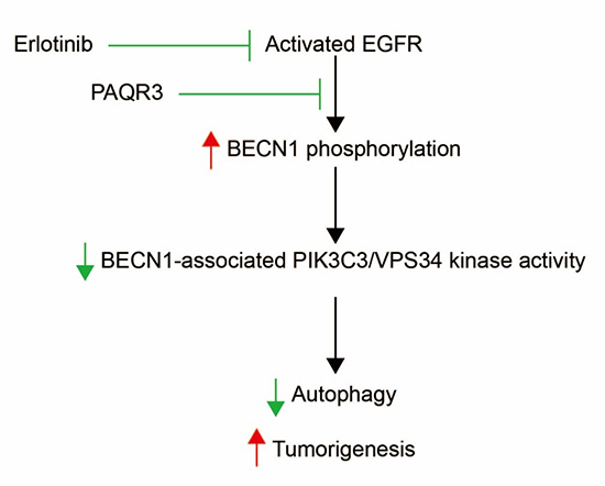 中国科学院上海营养与健康研究所陈雁课题组曹倩倩博士生等经过研究发现孕酮和脂联素受体3(PAQR3)调控NSCLC细胞自噬和增殖的新机制。PAQR3作为抑癌基因,在多种人类癌症中表达降低。在这项研究中,研究人员在细胞和动物水平发现PAQR3抑制多种NSCLC细胞的生长。同时,发现PAQR3作为重要的自噬调节蛋白能够促进厄洛替尼诱导的NSCLC细胞自噬的发生。进一步的机制探索发现抑制自噬可以完全阻断PAQR3对NSCLC细胞增殖的抑制作用,表明自噬是介导PAQR3抗肿瘤作用的关键节点。因此,该研究首次揭示了PAQR3对小细胞肺癌的抑瘤活性依赖于细胞自噬。在临床实践中,厄洛替尼或吉非替尼可用于NSCLC的治疗,基于PAQR3调控肺癌细胞自噬的这一特征,调控PAQR3的功能有可能增强这些药物的抗肿瘤活性。