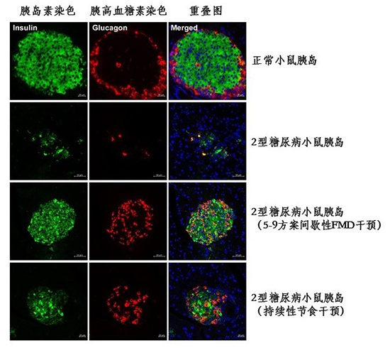 图示:4组小鼠的胰岛免疫荧光染色,可以看出2型糖尿病小鼠的胰岛β细胞数量显著降低,而在间歇性节食干预之后明显增加。