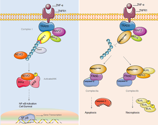 细胞死亡是多细胞生物体维持自身稳态与正常发育的基本生命活动,人类多数疾病从根本上说归因于细胞死亡异常(过多或过少)。RIPK1蛋白是调控细胞凋亡、细胞程序性坏死以及炎症信号通路中的关键分子,参与胚胎发育、造血系统发育以及免疫稳态维持等多种重要生物学过程,最近有报道发现RIPK1基因突变的病人同时表现自身免疫缺陷及自身炎症性疾病,提示RIPK1在人体免疫调控中具有关键作用,而且靶向RIPK1的小分子药物治疗渐冻症、风湿性关节炎以及结肠炎等疾病也在临床试验阶段。分子机理研究显示,RIPK1一方面通过参与介导NF-kB及MAPK信号通路促进细胞存活及炎症反应,另一方面RIPK1可以通过与FADD、Caspase8等分子互作介导细胞凋亡,而当凋亡通路被抑制时,RIPK1可以通过与RIPK3结合形成坏死小体,激活下游MLKL诱导细胞程序性坏死的发生。而目前对RIPK1在不同应激条件下如何通过转换不同的信号通路而决定细胞存活或死亡,这个关键的生死转换的分子机制仍不清楚。