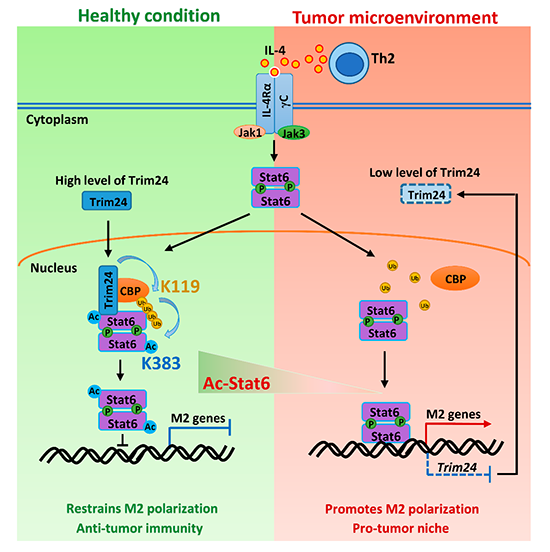 2019年9月25日,国际学术期刊Nature Communications在线发表了肖意传研究组与秦骏研究组合作的最新研究成果“Modulation of M2 macrophage polarization by the crosstalk between Stat6 and Trim24”。该研究揭示了Stat6乙?;鹘诰奘上赴鸐2极化,进而影响体内抗肿瘤免疫的作用机理,为抗肿瘤免疫的调控提供了新的分子靶标。