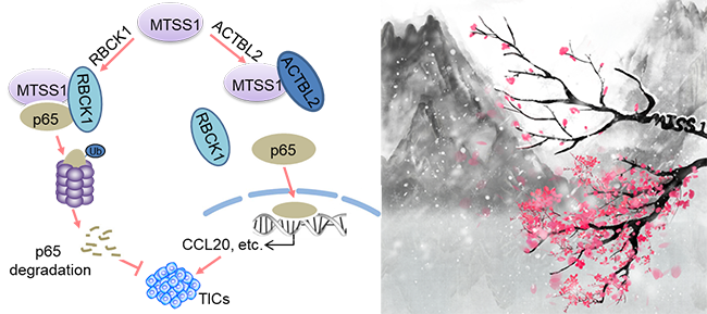 此项研究发现,在管腔型和基底型乳腺癌小鼠肿瘤模型中,敲除Mtss1增强了正常乳腺上皮细胞向肿瘤起始细胞的转化,并提高其致瘤性和转移性。在乳腺癌病人来源的异体移植物和类器官中同样证实了MTSS1抑制肿瘤起始的功能以及乳腺癌细胞的迁移与侵袭,表明MTSS1是乳腺癌发生发展的负调控因子?;蒲芯勘砻?, MTSS1与E3泛素连接酶RBCK1相互作用,促进RBCK1介导的p65蛋白的泛素化及降解,从而抑制NF-κB信号通路和肿瘤形成。同时,在癌细胞内存在另一蛋白ACTBL2,能通过与RBCK1竞争性地结合MTSS1,进而稳定p65,激活NF-κB下游靶基因的转录,促进肿瘤发生。