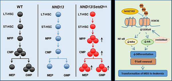 博士生陈冰怡和胡成龙在王兰研究员的指导下,发现SETD2的低表达预示了MDS的不良预后,并发现了Setd2的新功能:Setd2的缺失显著加速了MDS向AML的发展,表明Setd2在NHD13驱动的MDS向AML的转化中起着重要的肿瘤抑制作用。从机制上讲,Setd2的缺失会增强NHD13小鼠造血干祖细胞的自我更新,并损害NHD13小鼠造血干祖细胞的髓系分化。Setd2的缺失在NHD13小鼠的MDS阶段和AML阶段均发挥着独特的作用,包括HSC通路的上调和骨髓细胞分化通路的下调。该项研究确定在NHD13白血病细胞中,钙结合蛋白S100a9是Setd2的靶基因,在NHD13小鼠的骨髓造血干祖细胞中Setd2的缺失引起MAPK和NF-κB信号通路发生调变,从而使白血病起始细胞具有更强的生长优势。S100a9会触发包括MEP在内的造血干祖细胞死亡,并导致MDS中无效的造血作用。而且研究发现,加入重组蛋白S100a9可以恢复敲除Setd2的表型。此研究首次阐明Setd2在MDS中的作用机制,为Setd2在血液肿瘤中的研究提供新的研究策略。
