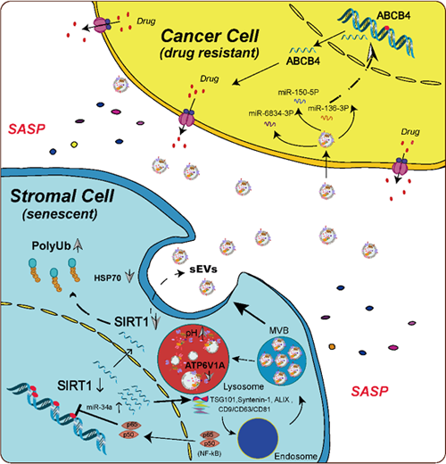 研究人员发现,同机体正常细胞相比,衰老基质细胞释放的小胞外囊泡数量、粒径和分布范围均发生深刻改变。衰老细胞中被动激活的转录机器NF-κB在驱动大量SASP因子产生的同时,也下调了NAD+-依赖性去乙?;窼IRT1这一抗衰老蛋白的表达。伴随SIRT1渐进性衰退的,则是全蛋白组泛素化水平的明显上升。与此同时,多亚基液泡H+-ATPase(V-ATPase)的催化亚基A(ATP6V1A)表达降低,造成衰老细胞溶酶体酸性化(acidification)功能失衡,最终导致小胞外囊泡的胞内合成与胞外释放大幅增加。在SIRT1激活剂SRT2104(或SRT1720)的作用下,衰老基质细胞合成胞外囊泡的能力被显著控制。在肿瘤微环境中,衰老细胞的胞外囊泡能够改变癌细胞的表达谱,包括以磷脂酰胆碱为底物的p-糖蛋白转运家族成员ABCB4表达上调,而其所涉及的药物外排泵活性随之上升。癌细胞的这一变化促成了其自身对化疗药物的显著抵抗,而敲除ABCB4或使用SRT2104则能有效降低衰老基质细胞小胞外囊泡赋予微环境中癌细胞的这种获得性耐药的潜力。