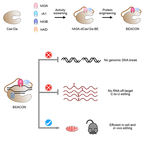 由DNA突变所引起的遗传性疾病,存在发病原因多样、患者众多、传统治疗方法效果差、费用高等特点。虽然利用CRISPR/Cas碱基编辑技术及最近融合了CRISPR/Cas和碱基编辑酶的碱基编辑器(Base editors, BEs)理论上能够矫正引发疾病的DNA突变,但是存在包括引起基因组DNA损伤、激活DNA损伤修复通路进而导致细胞的凋亡等一系列安全问题。为了解决这一安全性问题,研究人员对前期基于dCas12a(Li et al., Nat Biotechnol 2018)或者是nCas9(Wang et al., Cell Rep 2017; Wang et al., Nat Biotechnol 2018)构建的一系列BEs开展比较研究,发现虽然前期构建的dCas12a-BEs具有碱基编辑效率低下的缺点,但是其仅存在与对照一致的本底水平DNA损伤响应,提示dCas12a-BEs可能具有更高的安全性。为了提高dCas12a-BEs的碱基编辑效率,研究人员通过筛选和蛋白质工程改造等方法构建了基于hA3A和dCas12a的新一代碱基编辑系统BEACONs(Base Editing induced by human APOBEC3A and Cas12a without DNA break)。与目前所有的碱基编辑器相比,BEACON系列碱基编辑器在基因组产生高效碱基编辑的同时,仅具有本底水平的DNA损伤激活应答和本底水平的转录组RNA脱靶。更为重要的是,BEACON系统在小鼠动物体内也成功实现了精准、安全的碱基编辑。BEACON具备前期一系列碱基编辑系统的有效性、精准性和安全性,为碱基编辑系统在基础研究及未来临床领域的全面深入应用提供了更优的选择。在研究中,研究人员还构建了新一代的全转录组RNA编辑检测计算分析流程RADAR(RNA-editing analysis-pipeline to decode all-twelve-types of RNA-editing, https://github.com/YangLab/RADAR),可以准确高效地检测碱基编辑中存在的RNA水平脱靶效应。