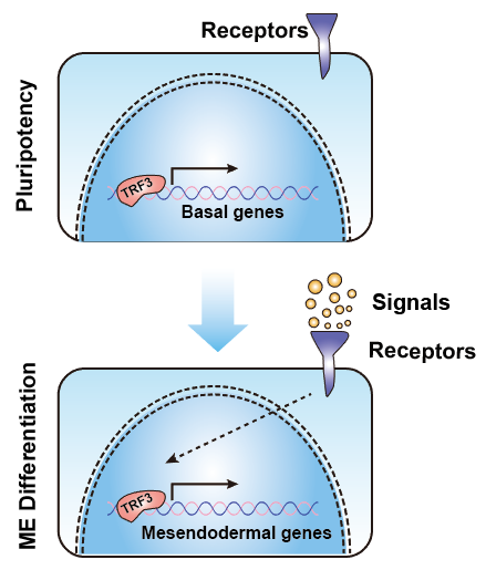 图示:通用转录因子TRF3可以特异性调节hESCs向中内胚层分化。ME: mesendoderm。