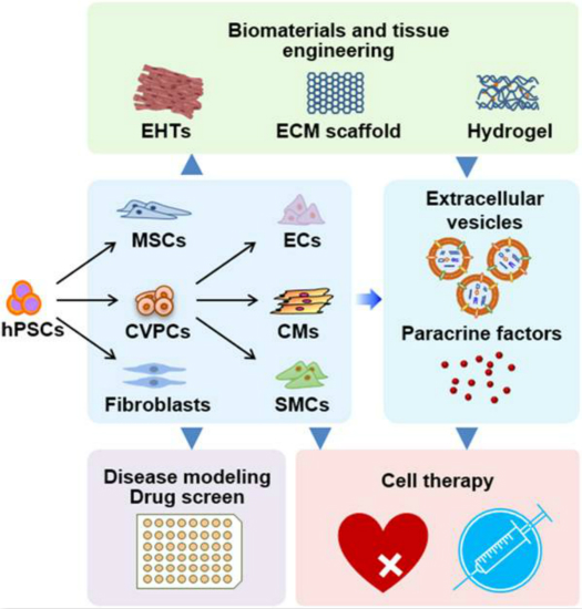 图示:hPSC衍生心肌谱系细胞在心肌损伤修复、疾病模型、药物研发中的应用。