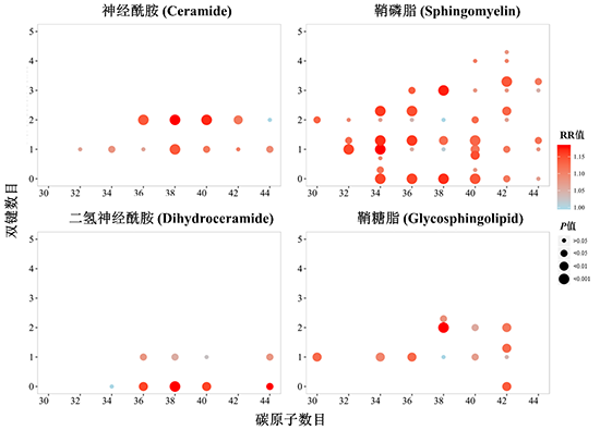鞘脂包括神经酰胺、鞘磷脂和鞘糖脂等,是一类结构和功能具有多样性的脂质分子。其中,神经酰胺作为细胞内的第二信使及脂毒性诱导分子能通过引发胰岛素抵抗、破坏胰岛β细胞功能等机制导致血糖稳态失衡和2型糖尿病的发生。然而,目前鞘脂与2型糖尿病的前瞻性研究仍较为缺乏,且包含鞘脂种类有限。