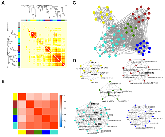 A. 鞘脂聚簇和关联热图;B. ??楣亓韧?;C. 以点线表示的??榇晃锿缤迹籇. 以点线表示的??榇晃锏淖油缤迹ɑ粕撼ち辞柿字?,青色表示长链鞘磷脂,棕色表示鞘糖脂,绿色表示超长链神经酰胺及二氢神经酰胺,蓝色表示羟基鞘磷脂)。