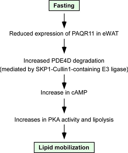陈雁研究组博士研究生黄美琴和林毅君等人发现高尔基体结构蛋白PAQR11在脂肪组织中的表达量很高。在对构建的PAQR11敲除小鼠研究中,发现敲除小鼠能够对抗高脂饮食诱导的肥胖,并且内脏脂肪部位有显著的脂肪分解水平的上升。进一步的研究发现,PAQR11的缺失能够导致磷酸二酯酶PDE4D的蛋白降解,从而激活了PKA诱导的脂肪分解途径。随后研究人员又在细胞水平上证明PAQR11是通过结合SKP1-CUL1-FBXO2复合体来调节PDE4D的泛素化,维持其蛋白稳定性。该工作首次揭示了高尔基体蛋白PAQR11能够调节蛋白泛素化、并且影响到脂肪细胞代谢状态。该研究丰富了对于脂肪分解代谢调控的分子机制的认识,并且阐明了通过对脂肪分解的调控能够影响机体的肥胖状态,为促进肥胖治疗提供了新的靶点。