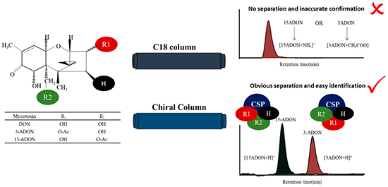 2021年9月16日,国际学术期刊Toxins在线发表了上海营养与健康研究所武爱波研究组题为“Validation of LC-MS/MSCoupled with a Chiral Column for the Determination of 3- or 15-AcetylDeoxynivalenol Mycotoxins from Fusarium graminearum in Wheat”的研究论文。3-、15-ADON是DON毒素的主要衍生型,二者在常规检测中难以被准确区分,对DON毒素的化学型精准鉴定带来障碍。该研究基于一种新的液相分离柱技术,能成功实现这两种衍生型毒素的精准识别和准确分离,为开展产DON毒素相关的微生物菌株、小麦寄主等表型鉴定研究提供了更精确的新方法(图2)。