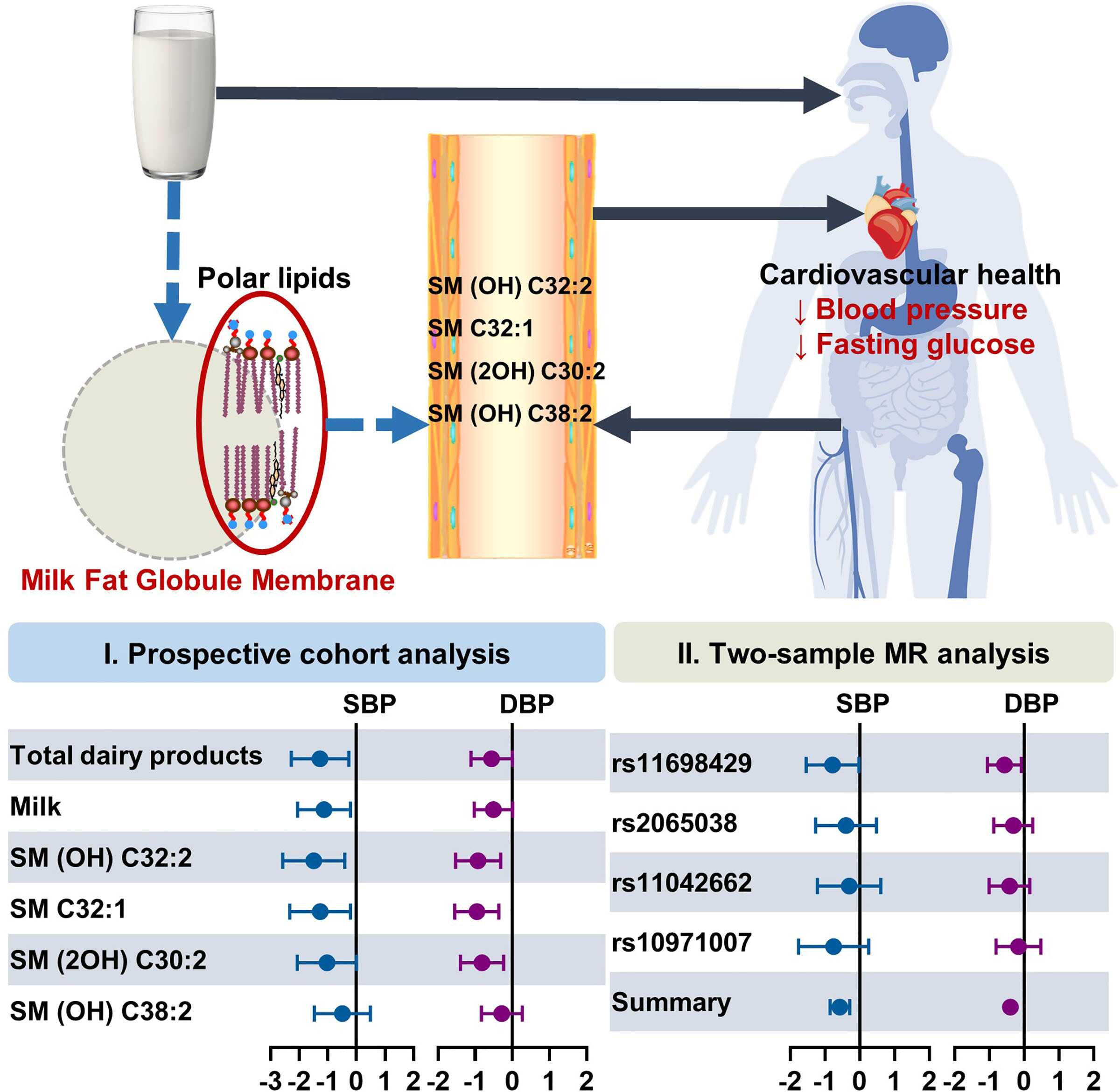 图. 奶制品摄入的鞘磷脂分子标记物与血压变化显著相关,并可能存在因果关系