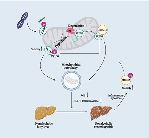 2022年8月16日,中国科学院上海营养与健康研究所丁秋蓉研究组在Journal of Hepatology期刊在线发表了标题为“MRG15 aggravates nonalcoholic steatohepatitis progression through regulating the mitochondrial proteolytic degradation of TUFM”的研究论文。该研究发现在NASH发生过程中,炎症因子会增强MRG15的蛋白稳定性,而MRG15会在线粒体外膜与TUFM相互作用并下调TUFM的82和91赖氨酸位点乙?;?,从而促进TUFM被线粒体ClpXP蛋白酶体降解。肝脏中TUFM的减少会导致线粒体自噬受到抑制、氧化应激增加以及NLRP3炎症小体的激活,加重炎症和纤维化。在肝脏中敲除MRG15后可以显著减缓小鼠NASH发展进程,该研究为NASH治疗提供了潜在的靶点。