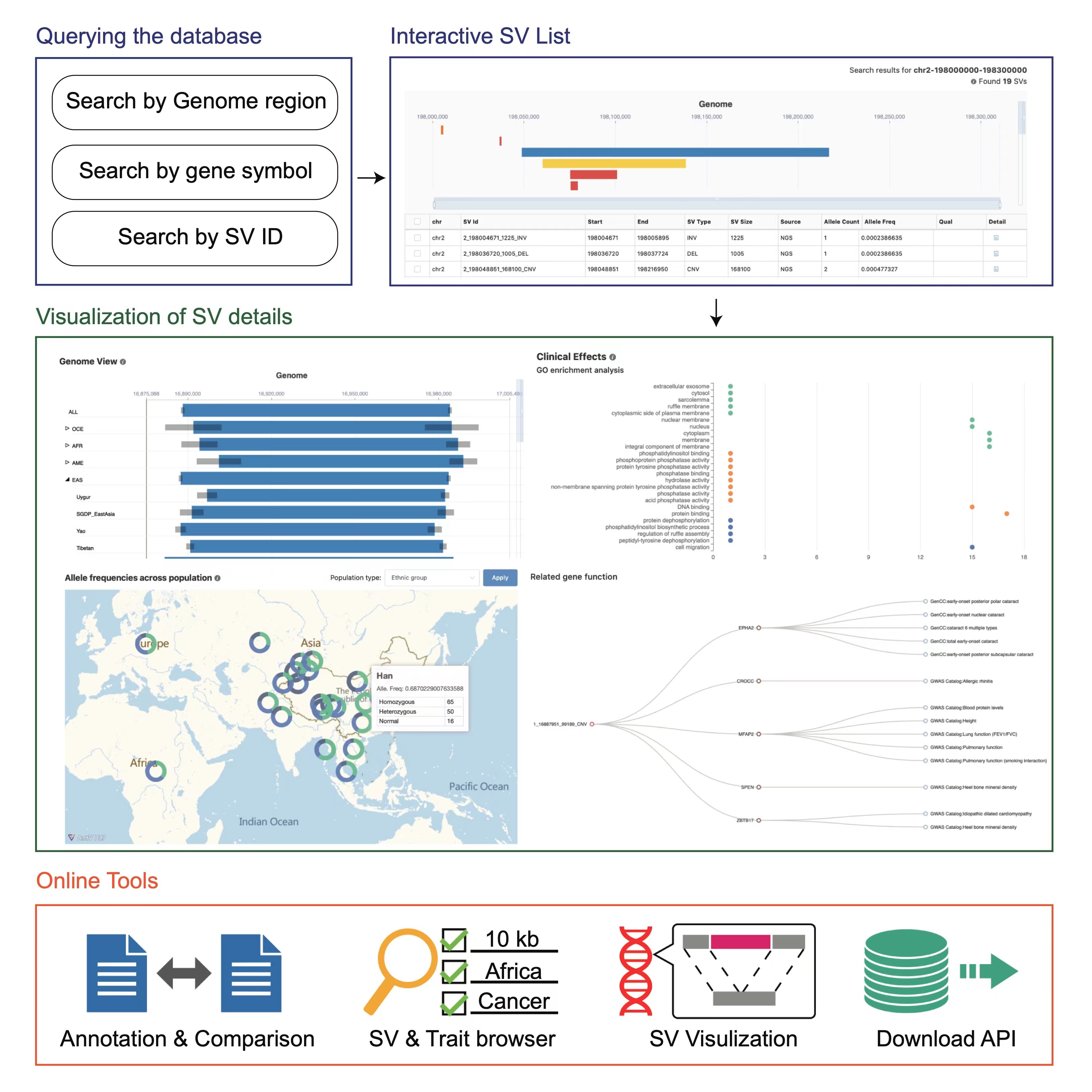 在数据库功能上,PGG.SV提供了简洁友好的查询功能,提供不同族群结构变异在基因组位置上的精确展示,以及全球各个族群之间的频率差异等统计信息。利用研究组先前积累的优势,PGG.SV与徐书华教授团队此前开发的PGG.SNV等数据库进行联动,借助连锁不平衡和基因组空间位置信息,将单核苷酸变异(SNV)的详细结果与结构变异相结合,以增强数据多样性的解析功能。此外,PGG.SV提供了丰富的临床效应分析和预测分析功能,根据与结构变异存在关联的基因和调控元件,提供对其潜在表型、功能的预测和富集分析,以及由特定疾病和表型检索相关结构变异的工具,以便有临床研究等需求的用户使用。