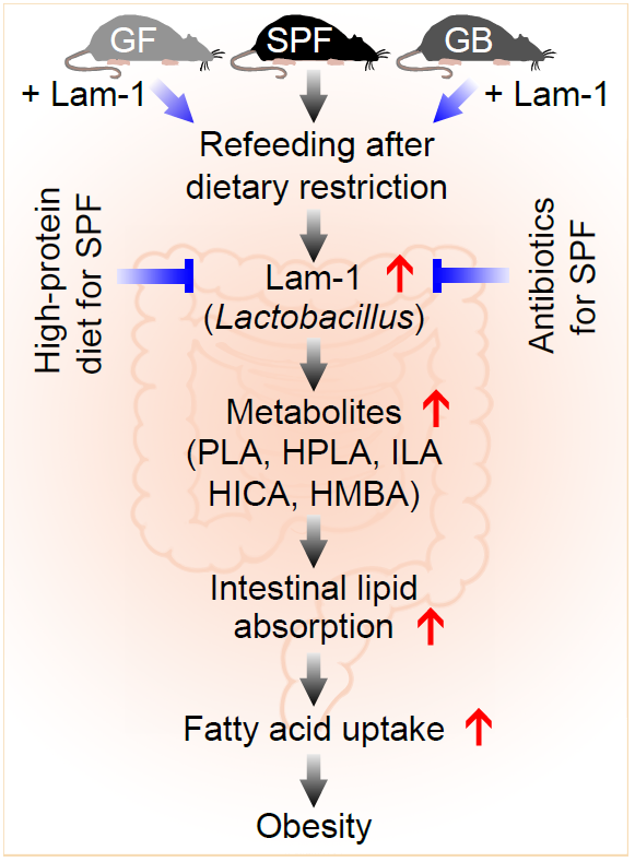 饮食是决定肠道菌群生态的关键因素,而肠道菌群可以影响肠道的脂质吸收以及脂肪组织的脂质代谢。为进一步研究饮食限制后体脂反弹以及高蛋白饮食抵抗体脂反弹的机制,研究人员进行了盲肠菌群的16S rDNA测序。结果发现饮食限制后小鼠的肠道菌群组成发生了显著改变,其中的乳酸杆菌比例从节食前的不足5%快速增长至约50%,高蛋白饮食可显著抑制乳酸杆菌比例的增加。研究人员接着从小鼠盲肠内容物中分离、鉴定了一种乳酸杆菌,并命名为Lam-1,同时验证了饮食限制后Lam-1丰度极显著增加,而高蛋白饮食小鼠的Lam-1比例显著降低。使用对Lam-1高度敏感的抗生素处理小鼠可显著抑制Lam-1的生长,进而减弱饮食限制后的肠道脂质吸收和白色脂肪组织的脂肪酸摄入,并最终减少体脂积累。更进一步地,通过无菌(Germ-free, GF)小鼠、悉生(Gnotobiotic, GB)小鼠以及正常饲养的无特定病原体(Specific-pathogen Free, SPF)小鼠的实验表明,补充乳酸杆菌Lam-1或者其产生的代谢物可显著增强肠道的脂质吸收以及白色脂肪组织的脂肪酸摄入,进而导致脂肪的积累。