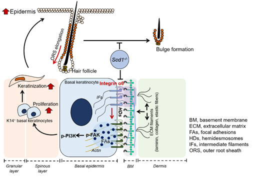 SCD1是催化饱和脂肪酸变为单不饱和脂肪酸的限速酶,该基因的缺失或突变会引起皮肤毛发显著减少。该研究发现,在毛发生长的周期过程中,Scd1的表达呈周期性变化。当SCD1缺失时,皮肤毛囊处于持续伸长状态,无论在第一个毛发生长周期还是剃毛诱导毛发生长过程中,均不能呈现经典的hair cycle形态变化,引起毛囊bulge形成障碍,无法为静息HFSCs提供储存场所。该研究发现,SCD1缺失引起的毛发减少并不是因为其直接影响HFSCs,也不是因为其调控微环境中的间质细胞、免疫细胞,而是由于K14角质形成细胞中缺失SCD1所造成。当K14角质形成细胞中缺失SCD1时,基底角质形成细胞上整合素(integrin)α6表达显著下降,引起皮肤半桥粒结构组装减少,整合素下游FAK-PI3K信号通路过度活化,促进角质形成细胞的增殖和角质化,从而抑制毛囊和外根鞘缩短,无法形成毛囊bulge结构。通过阻断PI3K过度活化或以油酸纠正SCD1介导的脂肪酸代谢异常,均可以有效地恢复SCD1缺失小鼠的半桥粒结构、毛囊bulge结构、静息HFSCs和毛发生长。该研究发现了脂肪酸代谢调控HFSCs干细胞龛形成和稳态维持的新机制,为理解毛发生长和皮肤稳态维持提供了重要的理论基础。