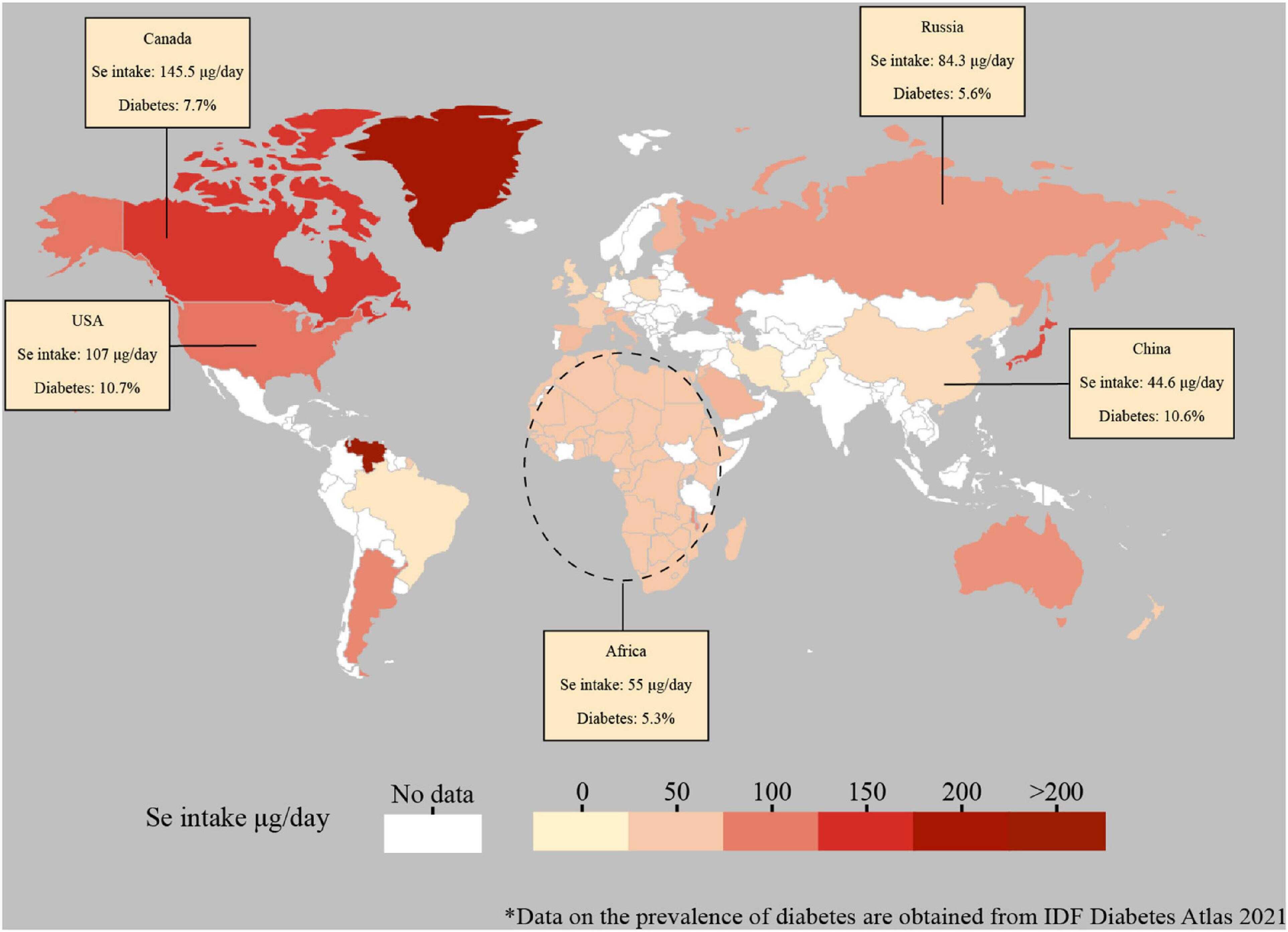 图注:全球硒摄入数据来源于已发表文献,其中,中国的硒摄入数据以中国大陆的数据为代表,非洲的硒摄入数据引用自非洲每日硒供给数据。糖尿病发病率数据截至2021年,数据来源于IDF网站(数据链接https://diabetesatlas.org/data/en/indicators/2/)。图中边界线不严格代表国家/区域。