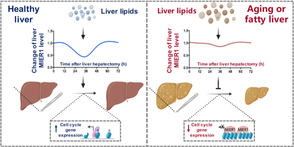 哺乳动物的健康肝脏组织在肝损伤后具有强大的再生能力。作为一种“新建再生”,在肝脏组织经历2/3肝切或者急性毒性损伤后,处于静息期的肝脏细胞(主要为肝实质细胞)会重新进入细胞周期进行增殖,生成新的肝脏细胞,在不到两周的时间内恢复全部的肝脏质量和功能。但肝脏再生能力在脂代谢紊乱的肝脏组织中显著减弱,如酒精或非酒精性脂肪肝、衰老肝脏等,导致肝脏损伤后无法完全恢复细胞数量和正常功能,促进了肝纤维化、肝硬化等终末期肝病的发展。同时,临床肝脏移植手术中,供体肝脏的脂代谢异常(如脂肪肝)也会导致其无法在受体内正常增殖,导致“小肝症”和移植手术的失败。