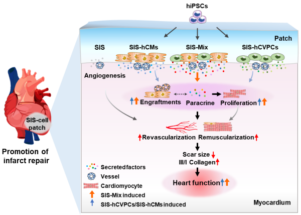 心肌梗死(心梗, MI)死亡是疾病致死的主要原因,其死亡率在我国呈逐年上升趋势,严重危害国人健康。心梗后大量死亡的心肌细胞被纤维瘢痕替代,进而导致心力衰竭。现有治疗方法难以逆转心梗后心肌细胞大量死亡和纤维瘢痕形成导致的心力衰竭,因此,亟需发展改善心肌细胞减容、促进梗死心脏组织和功能重建的方法。基于hPSCs衍生心血管细胞的移植治疗的探索显示了其应用前景。杨黄恬研究组和其他研究团队的工作证实hCVPCs和hCMs移植到小鼠、猪及非人灵长类动物梗死心脏中可显著改善心功能,减少纤维化,但仍面临hCVPCs驻留率低、心肌内注射hCMs发生室性心律失常等难题。因此,如何提高移植细胞驻留、疗效与安全性,明确适宜的移植细胞类型和作用机制对细胞治疗走向临床至关重要。脱细胞猪小肠粘膜下层细胞外基质材料(SIS)具有优越的生物相容性,支持干细胞附着和生长,在心梗后移植可促进血管生成和心功能恢复,但尚不清楚其是否可用于构建hPSCs衍生心血管细胞的补片。