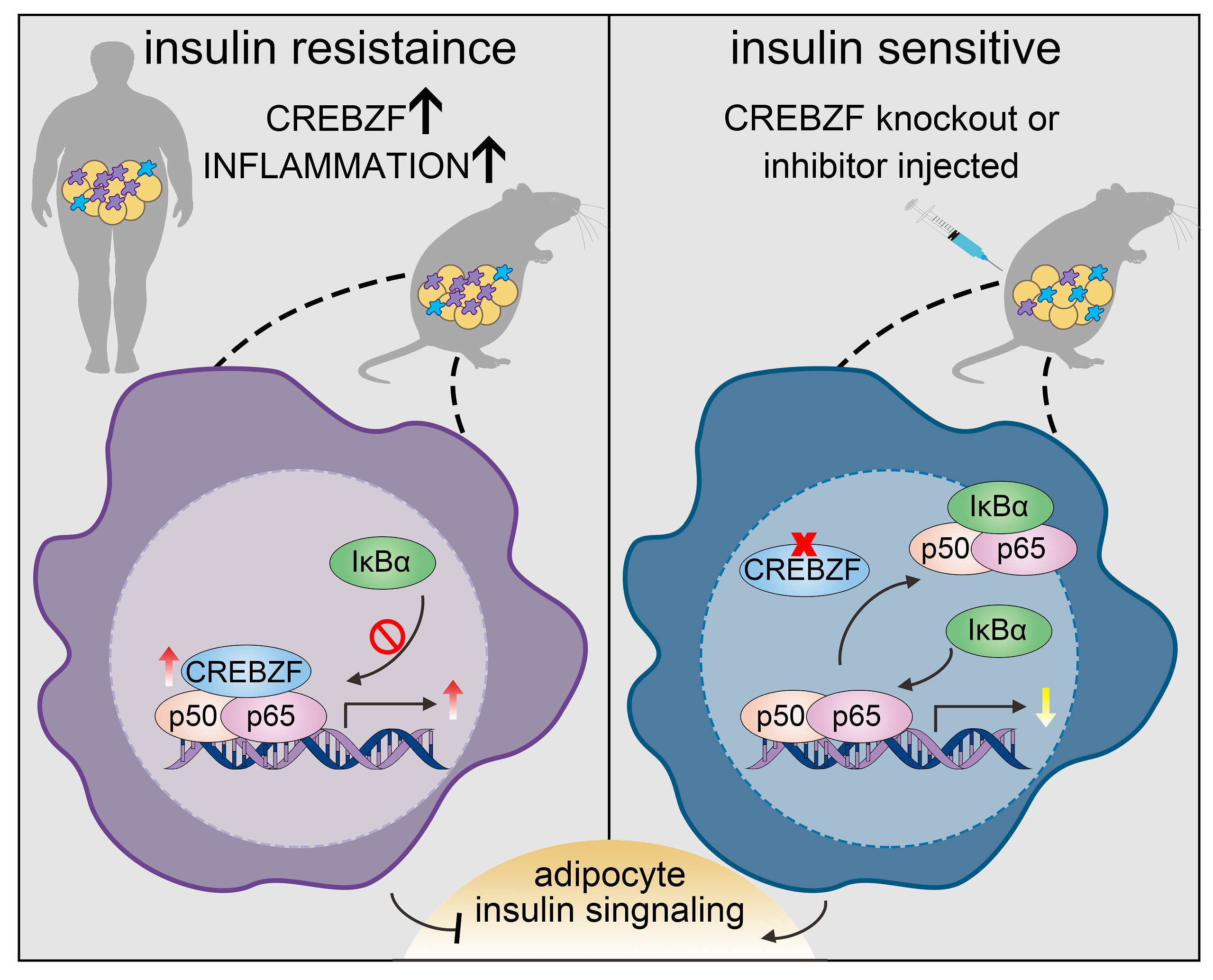 (在肥胖发生发展中,巨噬细胞CREBZF的过度激活通过与IκBα竞争性结合p65来增加NF-κB信号通路活性,从而加速脂肪组织慢性炎症反应与胰岛素抵抗。药理学抑制巨噬细胞CREBZF活性可能是治疗2型糖尿病的潜在策略)