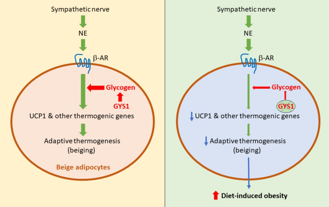 糖原是葡萄糖残基的分支聚合物。糖原的代谢包括糖原的合成和降解,主要受激素以及糖原合成酶(GS)和糖原磷酸化酶(GP)两种关键酶的控制。GS通过催化α-1-4糖苷键的形成,在糖原链上添加新的葡萄糖,在糖原合成的最后一步中起着关键作用。在哺乳动物中,GS有两种亚型:GYS1和GYS2,分别由Gys1和Gys2基因编码。Gys2仅在肝脏中发现,而Gys1在许多不同的组织中表达,如肌肉和脂肪。尽管与肌肉和肝脏相比,脂肪细胞中的糖原水平较低,但近年来人们开始认识到它在调节糖脂代谢协调中的重要性。脂肪细胞的适应性产热因其在对抗肥胖方面的潜在应用而成为近年来研究的热点。当受到冷暴露或儿茶酚胺刺激时,β3肾上腺素能受体被激活,进而导致下游cAMP-PKA信号转导和UCP1表达激活,从而增加能量消耗。