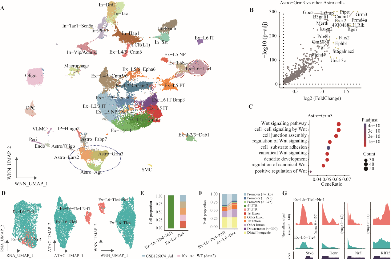 图2?整合单细胞多模态组学数据寻找新细胞亚群。A、整合单细胞多模态组学数据解析小鼠大脑皮层细胞亚群。B-C、Astro-Grm3特异性Wnt信号通路。D-G、解析数据发现细胞亚群EX-L6-Tle4-Nrf1。