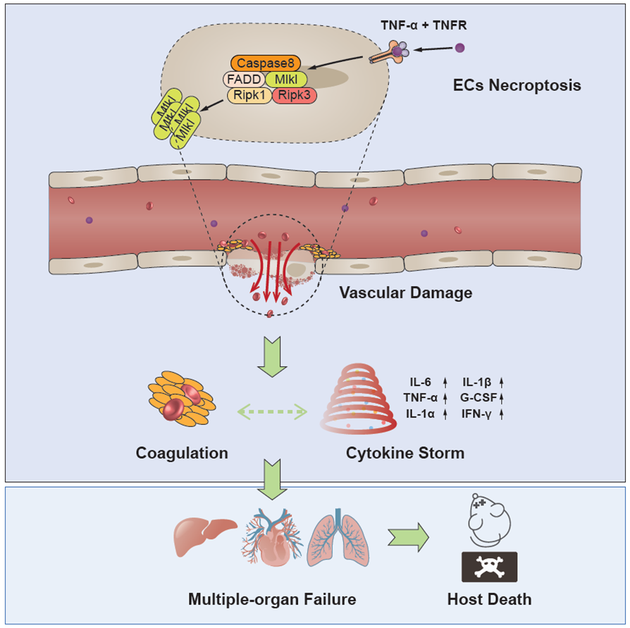 细胞因子的过度分泌会引发危及生命的全身炎症反应综合征,也表现为败血症或细胞因子风暴。全球每年有近5000万SIRS患者,且因SIRS死亡的人数居高不下。在2019冠状病毒大流行期间,过度的细胞因子风暴也是导致重症患者死亡的关键因素之一。尽管已进行长达30多年的研究,SIRS诱导多器官功能障碍综合征(MODS)并最终导致死亡的机制仍未明确,至今尚无单一疗法能够有效拯救SIRS患者的生命。因此,深入解析SIRS的病理机制尤为迫切。虽然凝血功能障碍和细胞程序性坏死已被认为是SIRS病理进程中的关键因素,但两者之间的相互作用机制以及具体发生细胞程序性坏死的细胞类型仍不清楚。