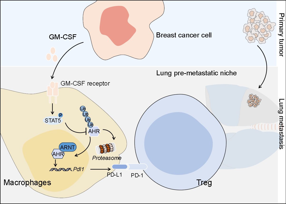 图:乳腺癌细胞释放GM-CSF调控肺脏巨噬细胞AHR信号,塑造转移前免疫抑制微环境,促进乳腺癌细胞的肺部定植与生长