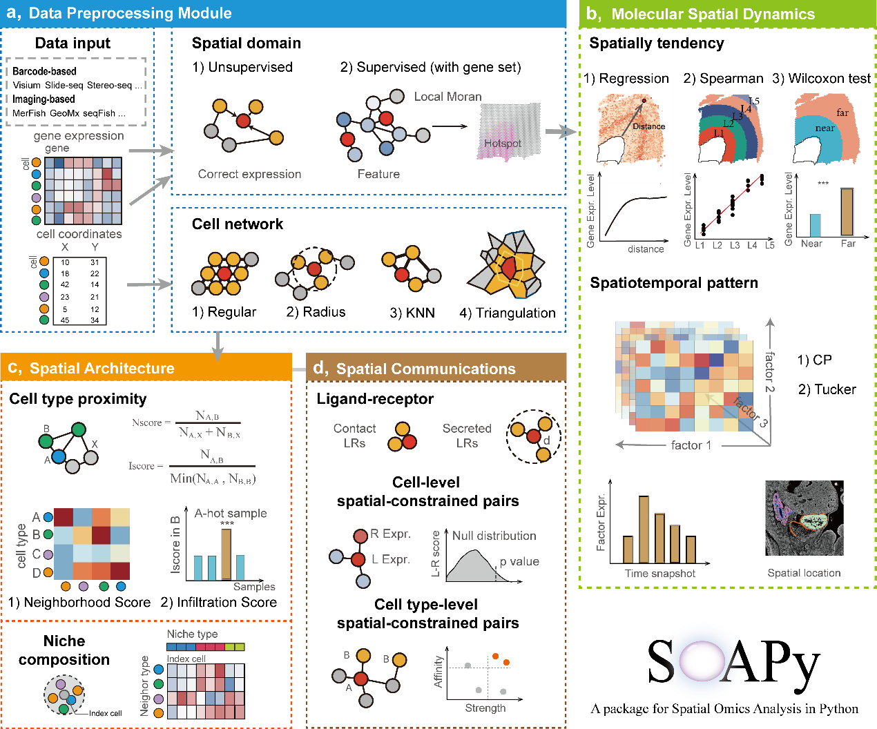 图:面向空间组学的微环境解析工具包SOAPy,包括预处理、空间分子动力学、空间结构和空间通讯四个??椤?/span>