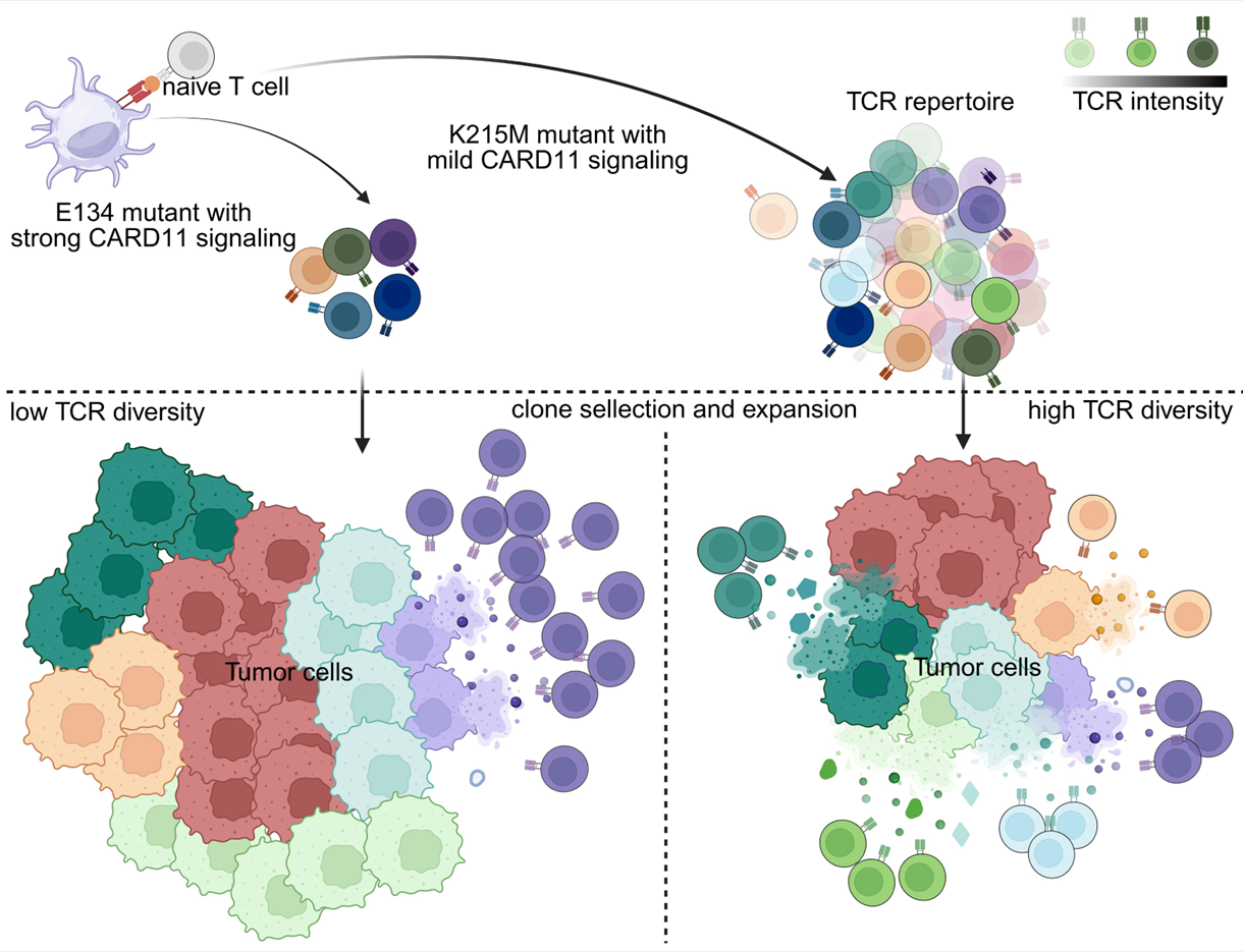 为此,研究人员基于携带多种CARD11突变的转基因小鼠建立肿瘤模型,发现CD8? T细胞中TCR下游CARD11信号强度过高阻滞了CD8? T细胞在肿瘤微环境中的耗竭性分化;相反,相对温和的TCR信号强度反而促进了Tex在肿瘤中的分化和积累。研究团队进一步分选小鼠及人非小细胞肺癌(NSCLC)肿瘤组织中浸润的CD8? T细胞进行体外杀伤实验,证实了Tex拥有强大的肿瘤细胞杀伤功能。然而,对Tex进一步进行的单细胞TCR测序发现,Tex群体呈现出高度寡克隆化特征,其TCR免疫组库的多样性显著受限,这意味着Tex只能识别非常有限的肿瘤抗原。由于肿瘤持续突变和进化导致的抗原逃逸,Tex最终无法有效清除肿瘤。最后,研究人员还进一步阐明了CARD11这一骨架蛋白通过感受上游TCR信号强度来调控TCR复合体在胞内运输与降解,从而决定了CD8??T细胞的分化命运。该研究首次通过揭示TCR信号强度与Tex分化的负相关性,证明了肿瘤抗原识别多样性受限是Tex无法清除肿瘤的关键原因。