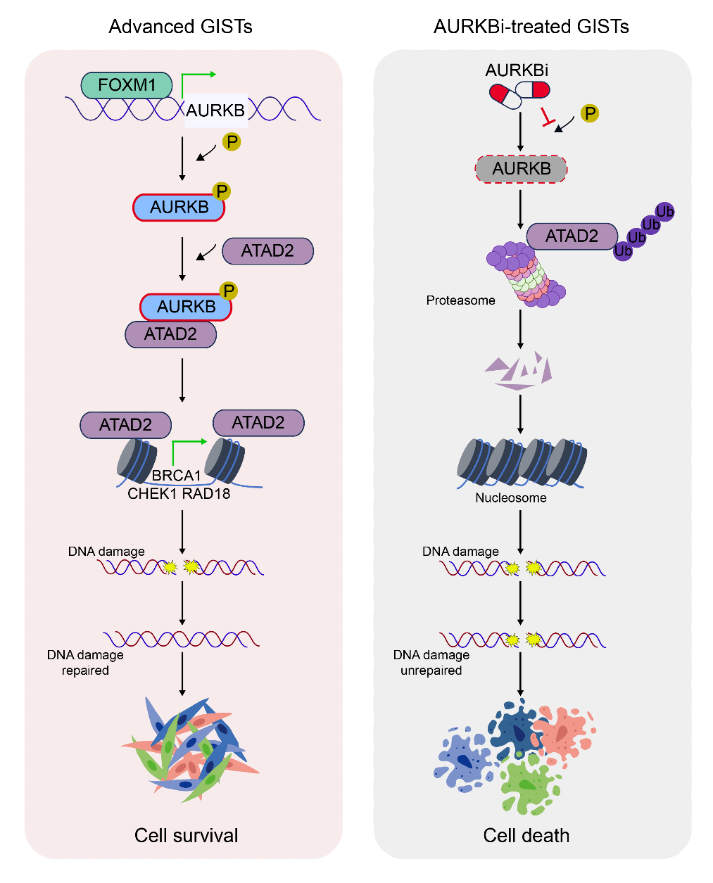 营养与健康所博士研究生程裕梅在王跃祥研究员指导下,通过早期/晚期GIST多组学筛选、CRISPR筛选和高通量化合物筛选三重整合筛选,鉴定出AURKB为不依赖于KIT突变类型的GIST新型治疗靶点。发现AURKB在高危及转移性GIST中显著高表达,而在低中危肿瘤中几乎不表达,这种表达上调由转录因子FOXM1直接调控。AURKB基因敲除显著抑制了肿瘤细胞在体外和小鼠体内的生长,并诱发细胞周期阻滞、衰老和凋亡?;蒲芯勘砻?,AURKB通过自身激酶结构域与ATAD2结合,稳定了ATAD2蛋白避免其被多聚泛素化标记降解。被稳定的ATAD2蛋白通过调控与DNA损伤修复相关基因区域的染色质开放性调节基因表达,增加肿瘤细胞抵抗DNA损伤并稳定基因组的能力,进而发挥促癌作用。